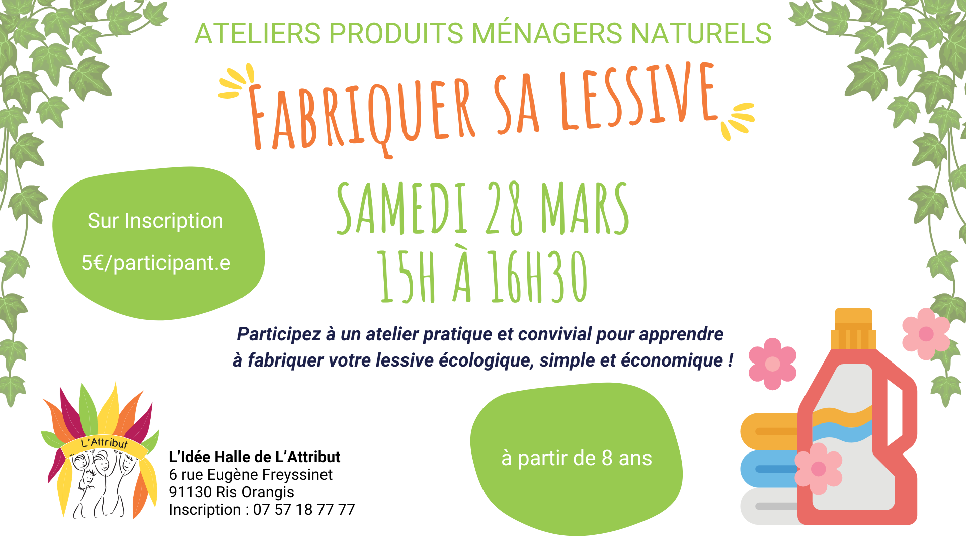 L’Idée Halle de L’Attribut vous propose un atelier pratique et convivial pour apprendre à fabriquer votre propre lessive naturelle, simple, efficace et économique.