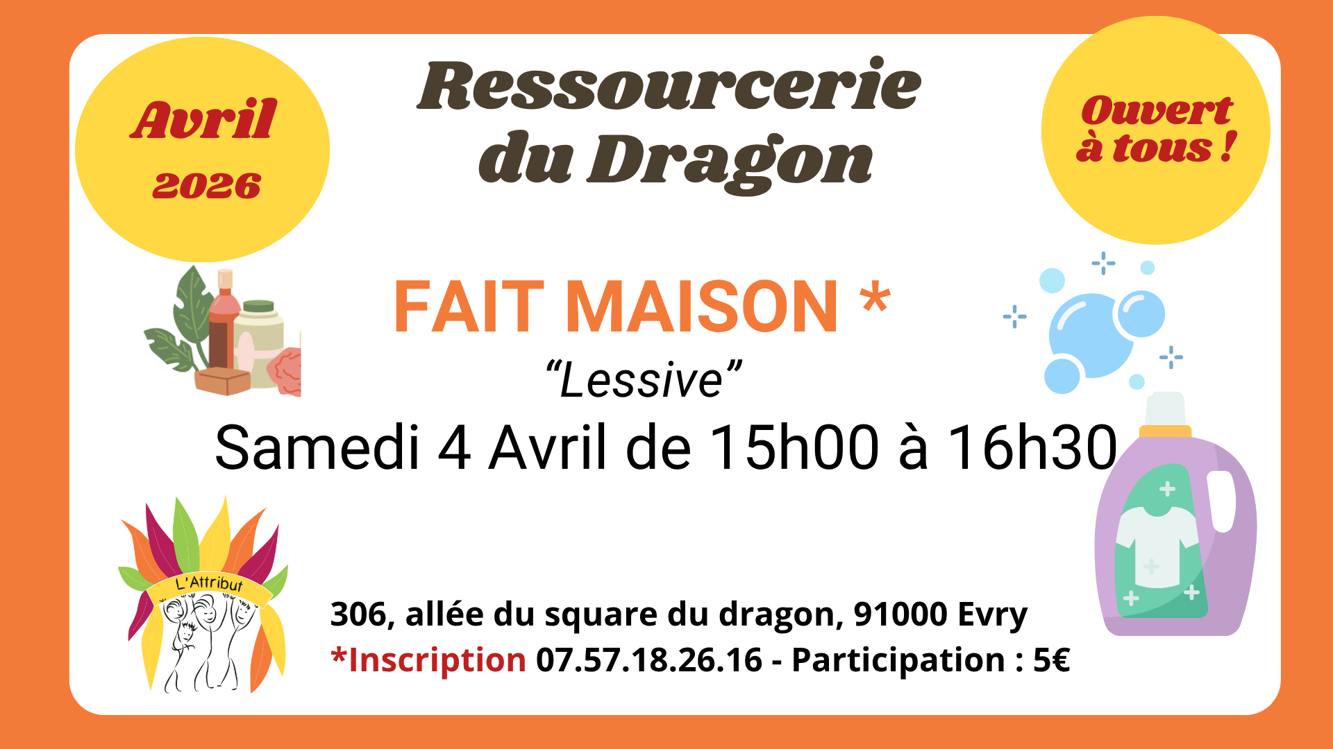 La Ressourcerie du Dragon de L’Attribut vous propose un atelier pratique et convivial pour apprendre à fabriquer votre propre lessive naturelle, simple, efficace et économique.