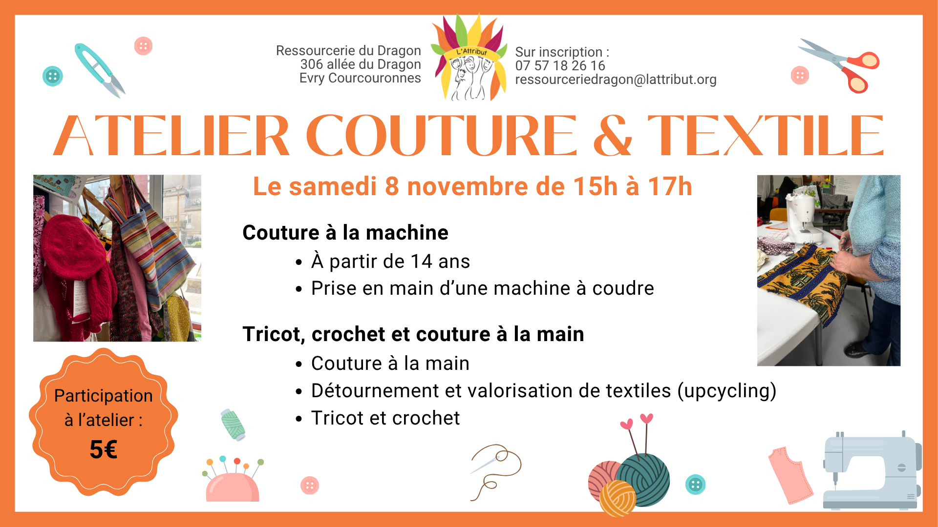 La Ressourcerie du Dragon - Evry-Courcouronnes 306 Square du Dragon, Evry-Courcouronnes, FranceRejoignez-nous pour un atelier créatif et convivial animé par les bénévoles de l'Attribut ! Apprenez à coudre à la machine, tout en découvrant les techniques manuelles comme le crochet et le tricot. Que vous soyez débutant·e ou curieux·se, cet atelier est l’occasion idéale pour créer des pièces uniques avec plaisir et simplicité. SUR RÉSERVATION, places […]