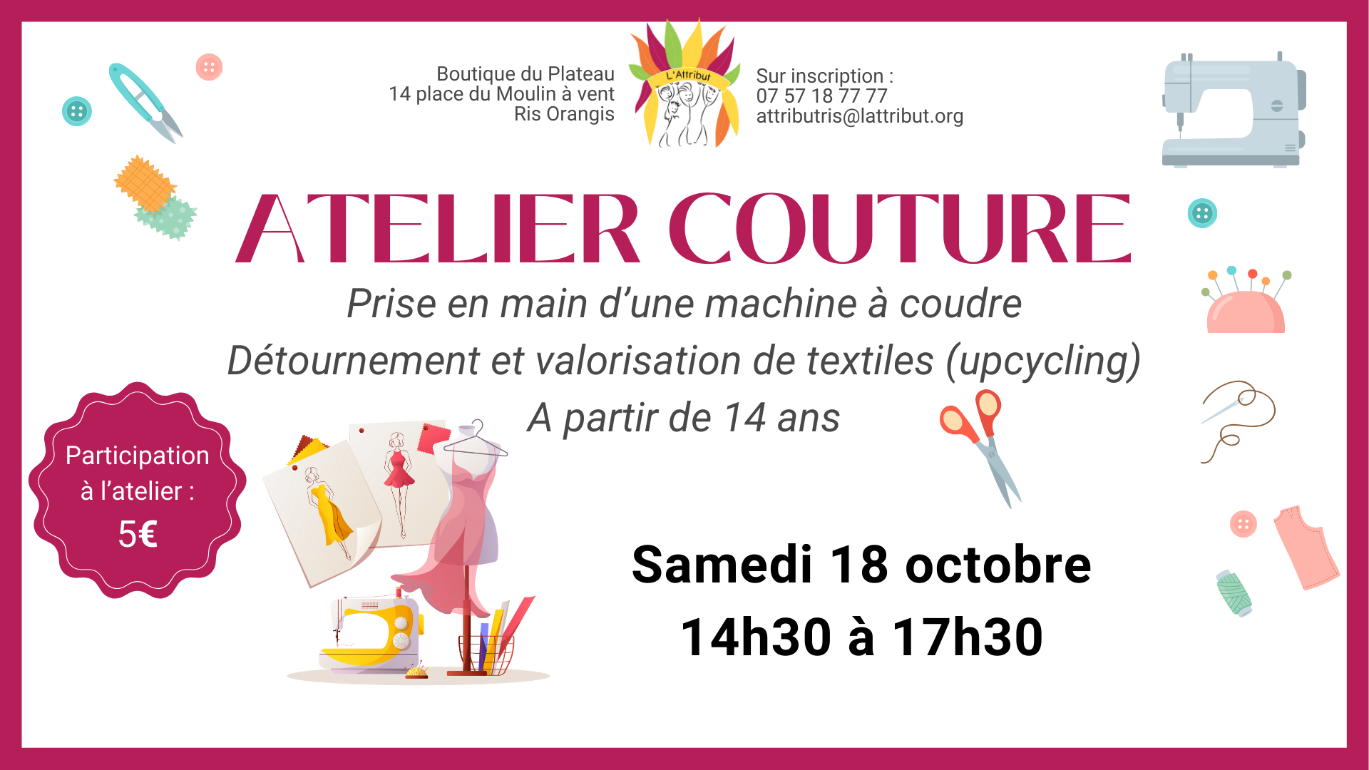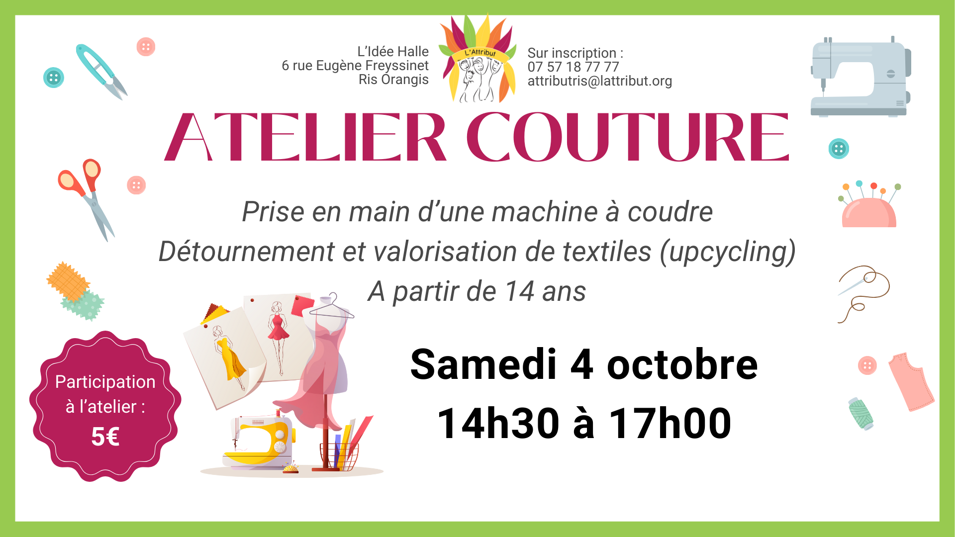 L'idée Halle rue Eugène Freyssinet, Ris-orangis, France✂️🧵 Atelier Couture Fun & Créatif avec L’Attribut 🧵✂️ Envie de donner une seconde vie à tes fringues ?De dompter une machine à coudre (sans te coudre les doigts 😅) ?Rejoins les bénévoles de L’Attribut pour un atelier couture placé sous le signe de la créativité et du partage ! Au programme :✨ Prise en […]